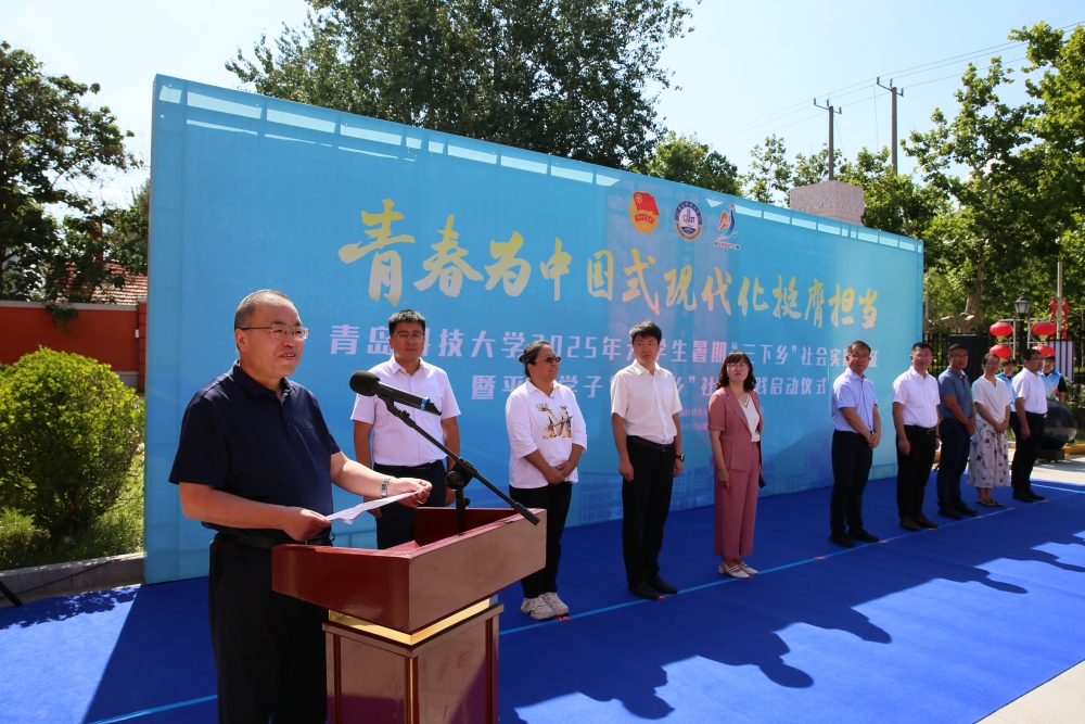仪式上,与会领导共同启动2025年大学生暑期“三下乡”社会实践活动,并为实践团队代表授旗。校团委书记刘跃宁与共青团平度市委书记张新宇共同为大学生社会实践基地揭牌。校团委副书记李浩介绍了学校2025年暑期“三下乡”社会实践整体安排。蒋科硕作为学校暑期“三下乡”社会实践学生代表发言。