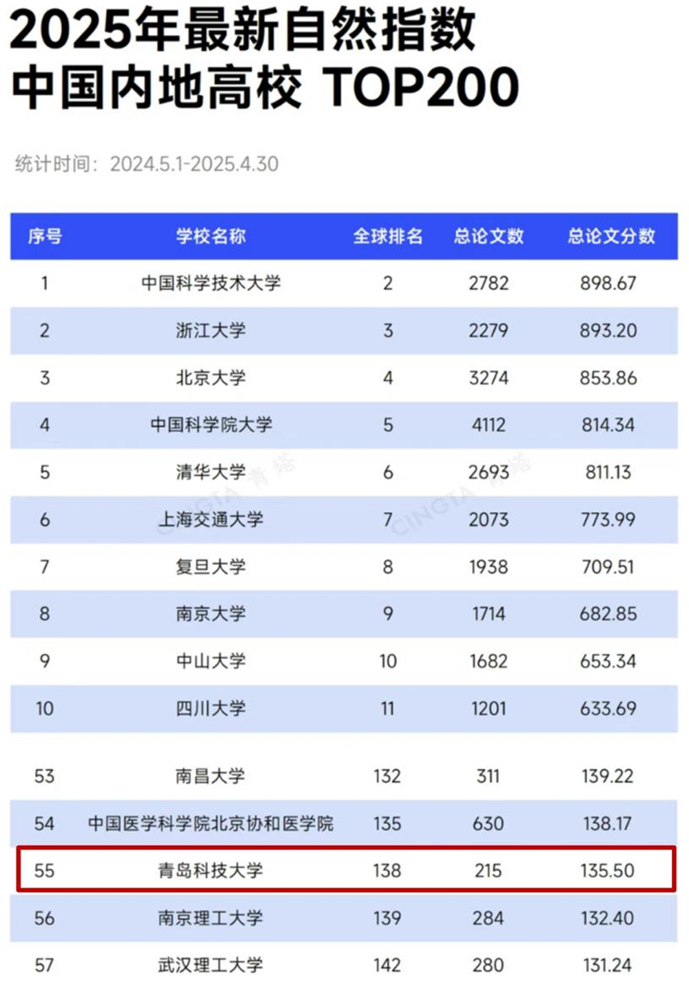 日前,自然指数官网更新了最新的自然指数排名(统计时间节点为2024.5.1-2025.4.30)。统计结果显示,中国内地共58所高校进入全球学术排名前150位,3044am永利集团3044noc以发文总量215篇、总论文分数135.50的优异表现,居全球高校排名第138位,内地高校排名第55位;全球高校排名和内地高校排名分别比上期(统计时间节点为2024.4.1-2025.3.31)提升3个名次和5个名次。