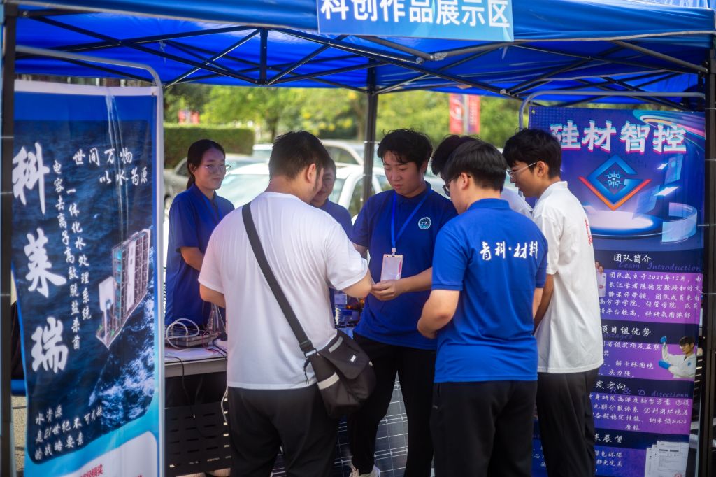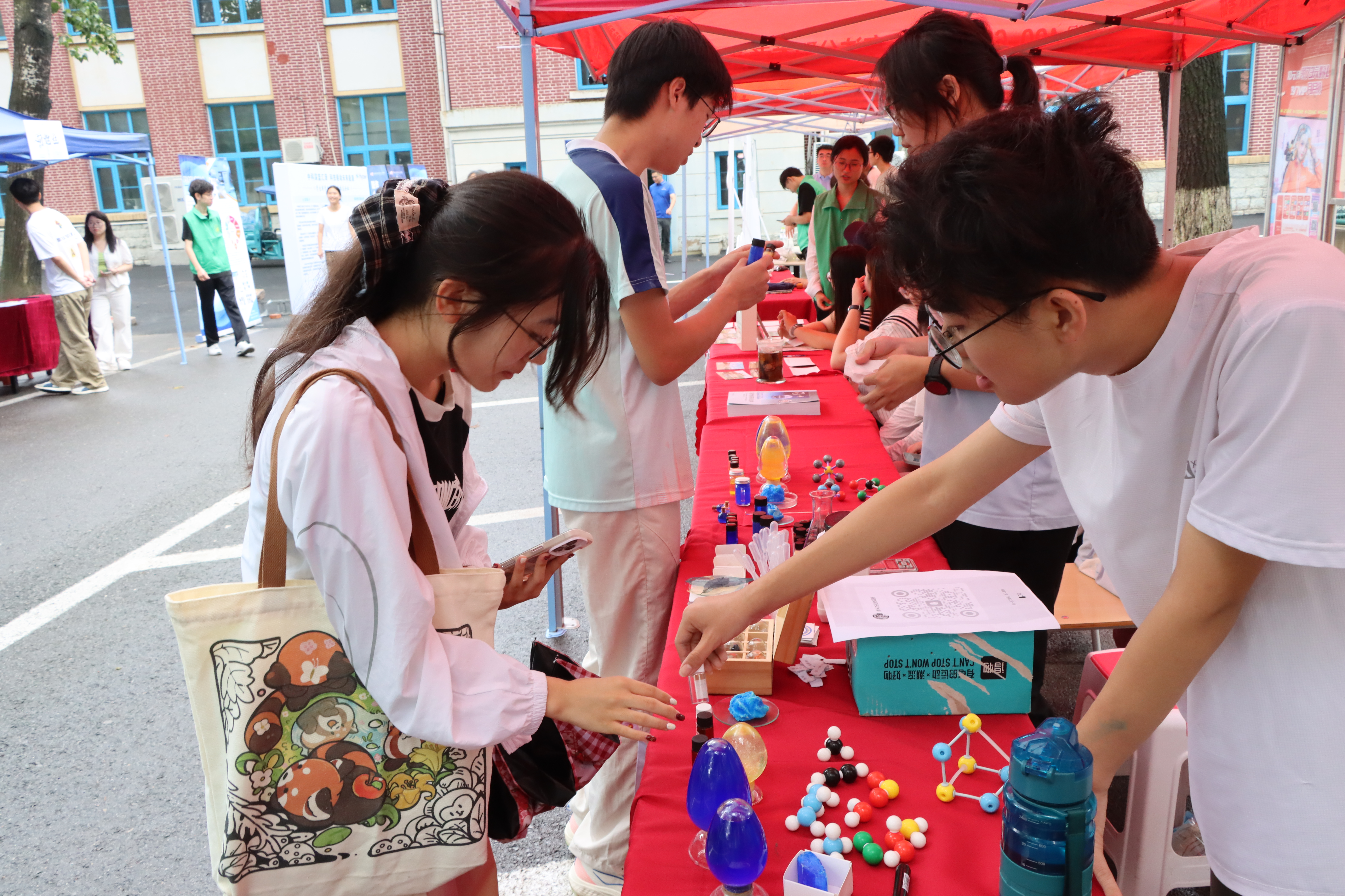 化学与分子工程学院以“青春‘化’时代,扬帆新征程”为主题,在迎新现场依据学科特色设计活动,以饱满的热情和体贴的服务迎接新生的到来。设计“你好,锌铜学!”主题喷绘拍照打卡点,营造热情的迎新氛围;“触碰化学,催化梦想”实验展演区,“蓝晶雨”“风暴瓶”等趣味化学反应吸引新生驻足体验;“指尖上的海洋馆”科普海洋知识,加强爱护海洋环境意识,真实的海洋标本让新生感受到海洋的魅力;设立师生面对面专岗、党员先锋岗、学生会志愿者等迎新服务队,传递科大温度,确保迎新工作高效有序。